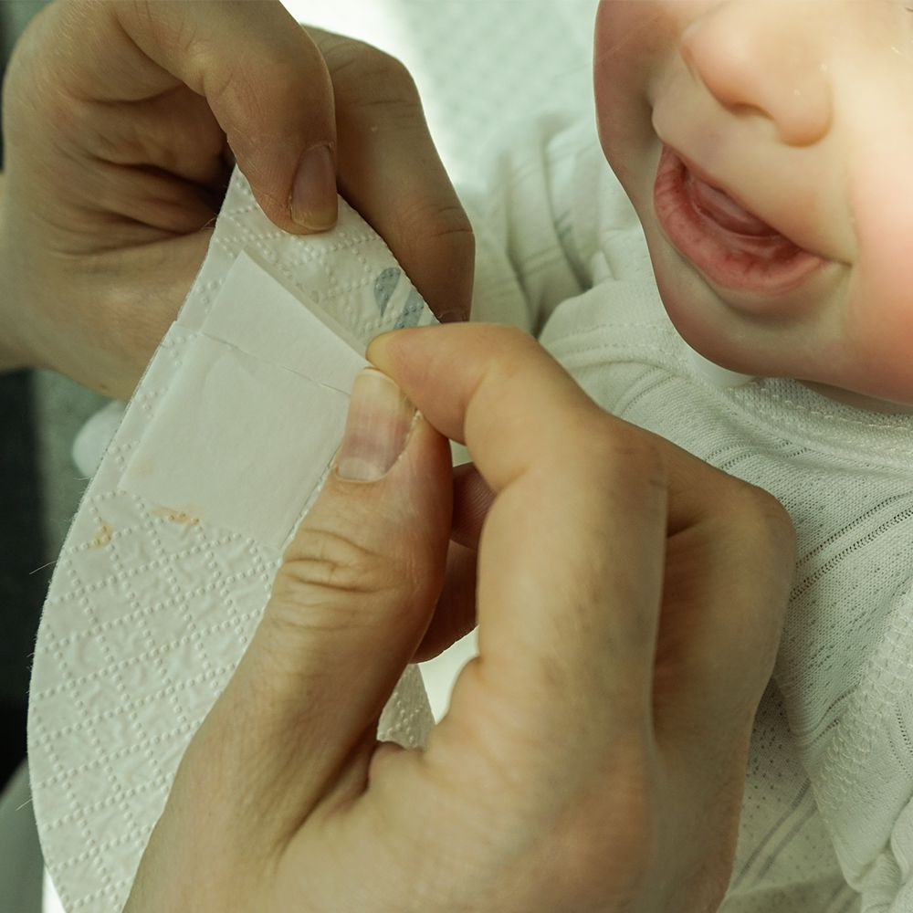 Rupeti usor pe linia perforata a bavetei Indepartati hartia de protectie de pe banda dublu-adeziva si lipiti-o in functie de dimensiunea gatului bebelusului.