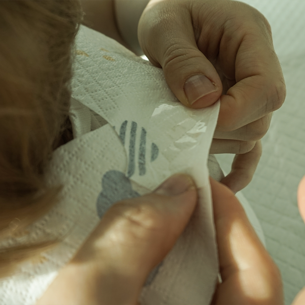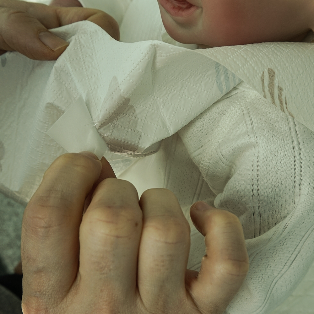 Rupeti usor pe linia perforata a bavetei Indepartati hartia de protectie de pe banda dublu-adeziva si lipiti-o in functie de dimensiunea gatului bebelusului.