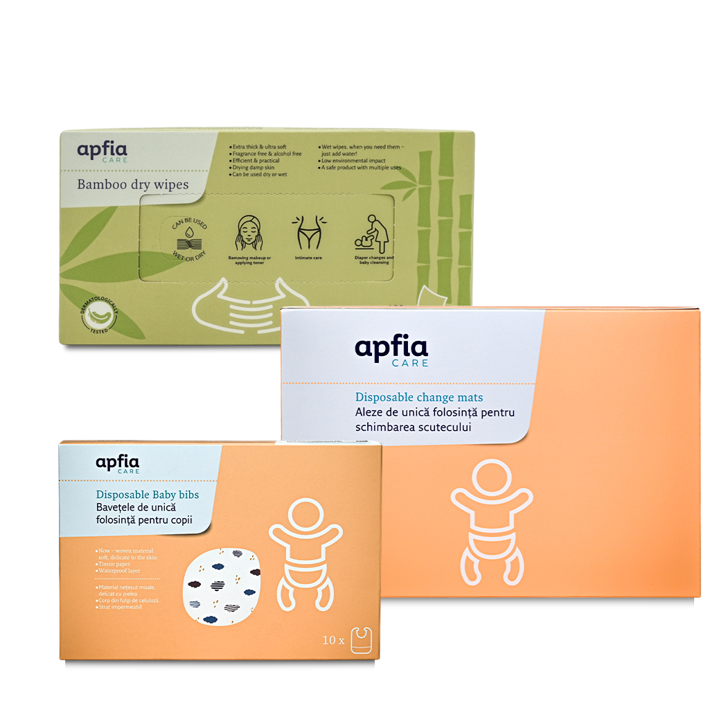 Bavetele de unica folosinta, destinate utilizarii la copiii cu varsta peste 4 luni, sunt potrivite pentru utilizarea acasa sau in calatorii, cu suprafata impermeabila si buzunar mare pentru protejarea hainelor. Bavetele au benzi adezive și răieturi speciale pentru a fixa și regla cât mai bine bavete pe hainele copilului